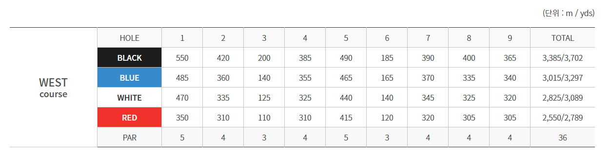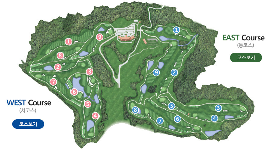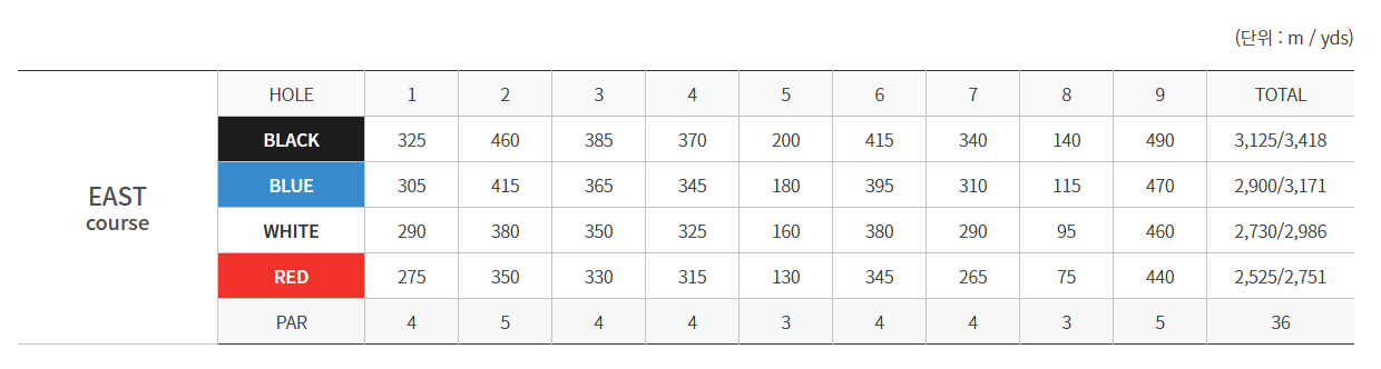 전장이 6,510M(7,120YDS)로서 긴 편이며 지형의 흐름을 자연스럽게 잘 살린 코스로서 16개의 크고 작은 연못과 33개의 벙커들이 조화롭게 배치되어 플레이의 묘미를 더해 주는 코스입니다. 코스마다 1300여 주의 기품 있는 금강송과 홍단풍. 벚나무. 산딸나무. 꽃사과. 덜꿩나무. 목수국. 불두화. 철쭉 등 다양한 수목들과 사 스타데이지. 금계국. 수레국화. 감국 등 온갖 야생화들이 사계절 피고 지고 많은 억새와 어우러져 아름다움을 더 해 주는 코스입니다.