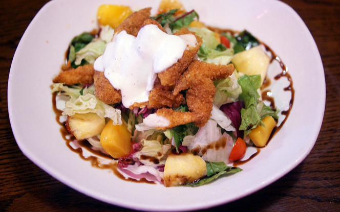 가볍게 식사를 원하시는 분들에게 추천드리는 크리스피 치킨 샐러드는 바삭한 치킨 텐더와 신선한 샐러드의 조합이 매력적입니다. 망고와 함께 제공되는 드레싱은 이 메뉴의 맛을 한층 끌어올립니다.