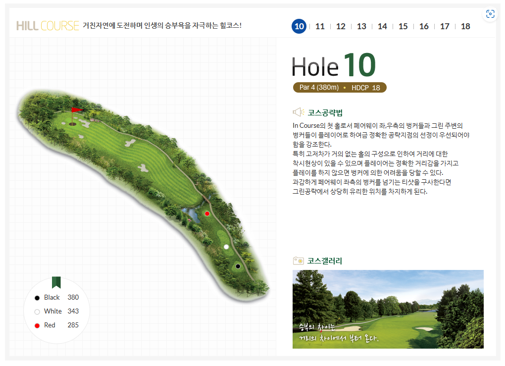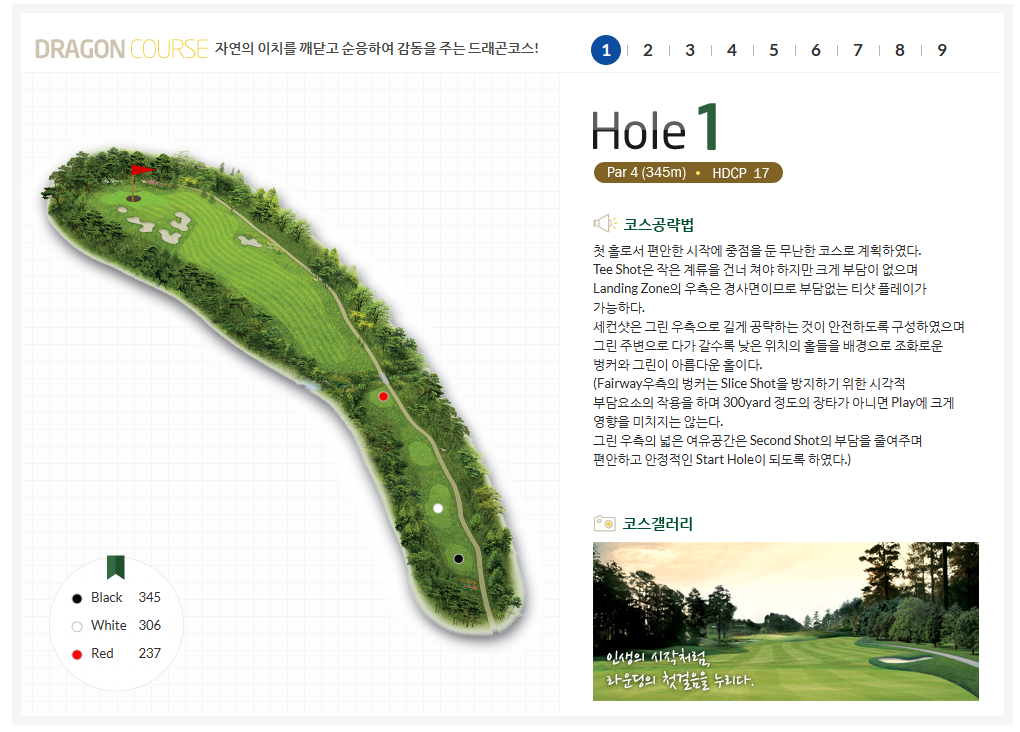 이 골프장은 넓은 페어웨이와 다양한 난이도의 코스로 유명합니다. 특히 5번 홀과 16번 홀은 국내 최고의 파 3홀로 손꼽히며, 골퍼들에게 다양한 볼거리와 즐길 거리를 제공합니다.