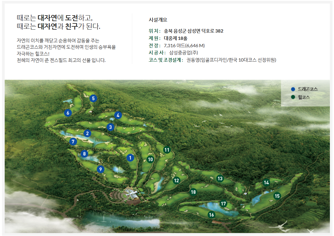 충청북도 음성군 삼성면에 자리한 젠스필드CC는 골프의 낙원입니다. 자연 친화적인 산악 지형에 위치한 이곳은 2000년 10월에 골프 팬들을 위해 문을 열었습니다.